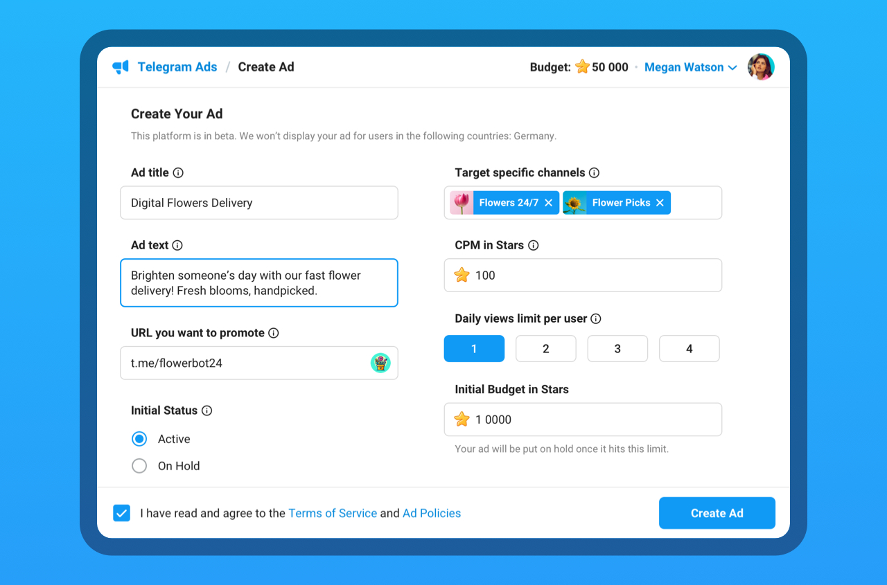 任何人都可以在公开的 Telegram 频道中投放注重隐私的广告,以推广自己的机器人、频道或群组。